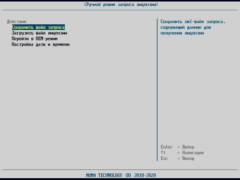 Для создания файла запроса для получения лицензии необходимо в меню «Ручной ввод лицензии» необходимо выбрать пункт «Сохранить файл запроса». Необходимые данные будут сохранены на USB-накопитель в файл с именем «numa_license_req_XXXXXXXX-XXXX-XXXX-XXXX-XXXXXXXXXXXX.xml».