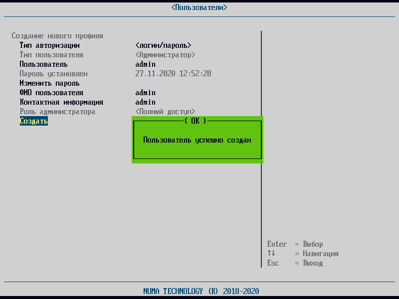 Для дальнейшей работы необходимо создать учетную запись администратора. Для этого в меню «Подготовка к работе», выбрать раздел «Создать администратора». В форму создания нового профиля необходимо ввести параметры администратора. После создания администратора вход в меню администрирования Изделия будет осуществляться с его учетными данными.