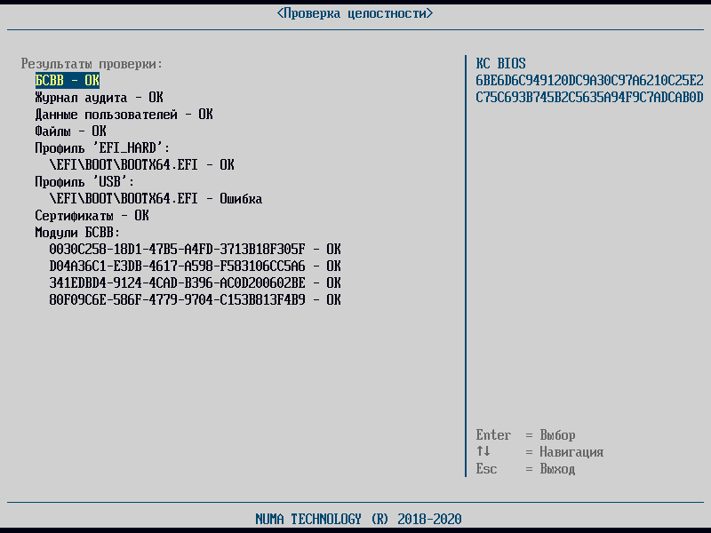 Изделие обеспечивает контроль целостности по ГОСТ Р 34.10-2012 модулей БСВВ Numa BIOS, а также образа Изделия (Numa_Arce.efi).