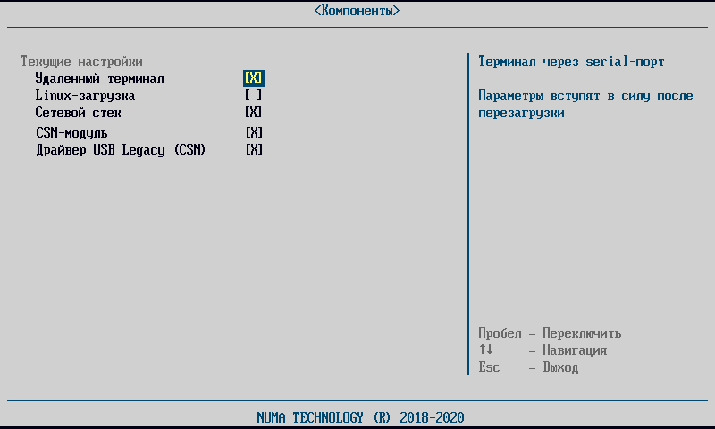 - Для Изделий, функционирующих на аппаратных платформах с процессором CoffeeLake (AQ H246) и SkyLake, для активации пункта «Драйвер USB Legacy (CSM)» необходимо сначала включить пункт «CSM-модуль», только после этого пункт «Драйвер USB Legacy (CSM)» будет доступен.
