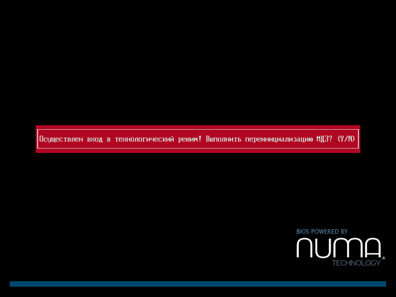 Переход в технологический режим обеспечивается только путем физического доступа к плате СВТ, на которое установлено Изделие. Для перехода в технологический режим необходимо отключить питание СВТ, извлечь батарею RTC не менее чем на 1 минуту (или переключите джампер типа «CLR CMOS» в положение «3-4» на несколько секунд). После подачи питания при загрузке отображается информационное окно входа в технологический режима (см. рисунок ниже) с предложением переинициализации Изделия.