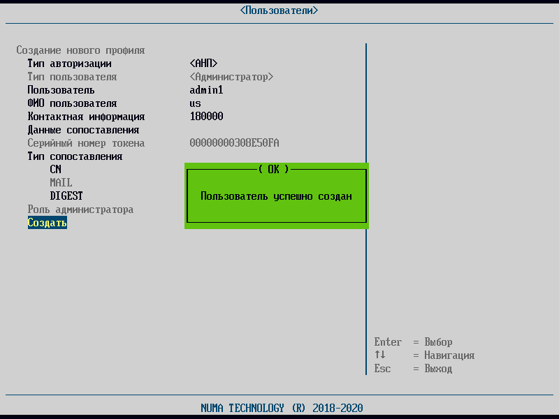 в меню «Создать Администратора» ввести данные для создания административного пользователя, указав в качестве данных сопоставления пользовательский сертификат токена (см. рисунок ниже). Подробно процедура создания пользователя описана в разделе Создание профиля пользователя;