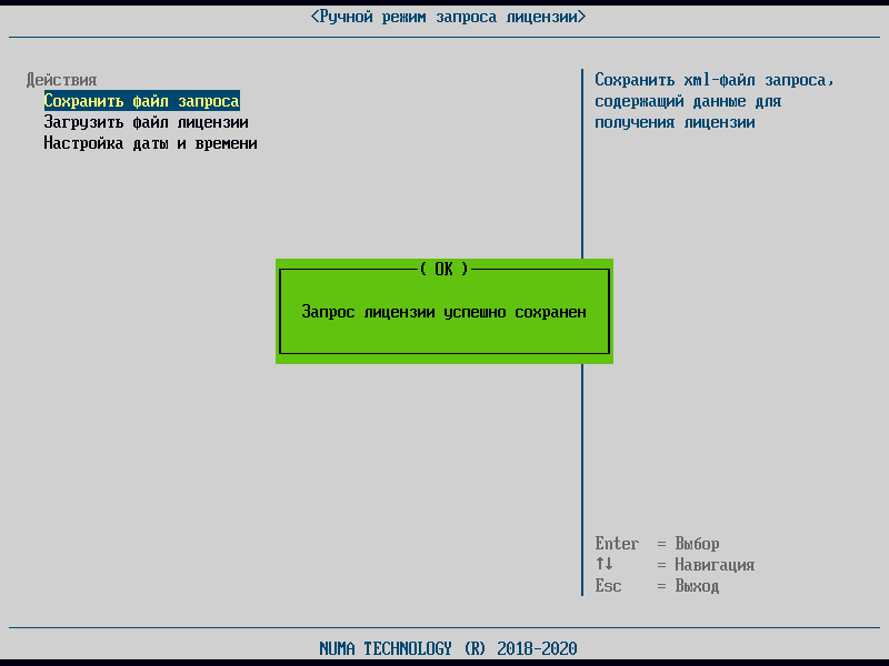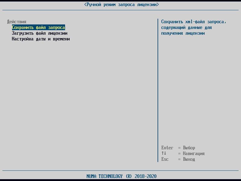 для создания файла запроса для получения лицензии в меню необходимо выбрать пункт «Сохранить файл запроса». Необходимые данные будут сохранены на предварительно подключенный к СВТ USB-носитель в файл с именем «numa_license_req_XXXXXXXX-XXXX-XXXX-XXXX-XXXXXXXXXXXX.xml»;
